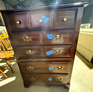 Furniture - Tall chest of drawers, cabinet with mahogany veneer, glass top tables. Grey 2-seat recliner, matching 3-seat and 2-seat recliners. Floral print recliner, floral print upholstered chair. Rustic coffee table/storage. Corner Cabinet, round oak table with wrought iron base and leaf. Desks, love seats, recliners. Dining sets including round or rectangular tables with matching chairs. Much more, come and see what's been added.